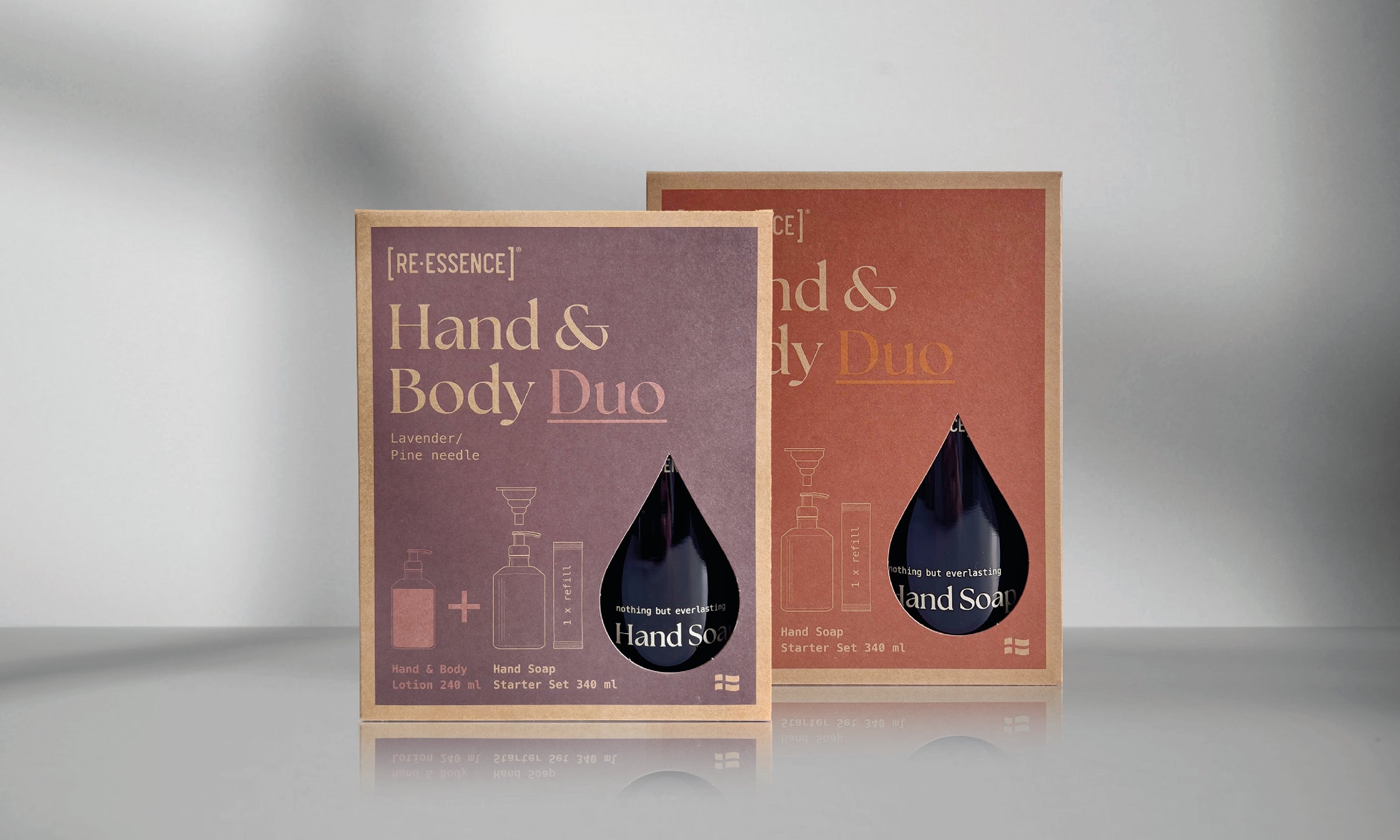 Køb vores glasflasker én gang – og genopfyld dem igen og igen med [RE·ESSENCE] håndsæbe pulver og hand & bodylotion refills.