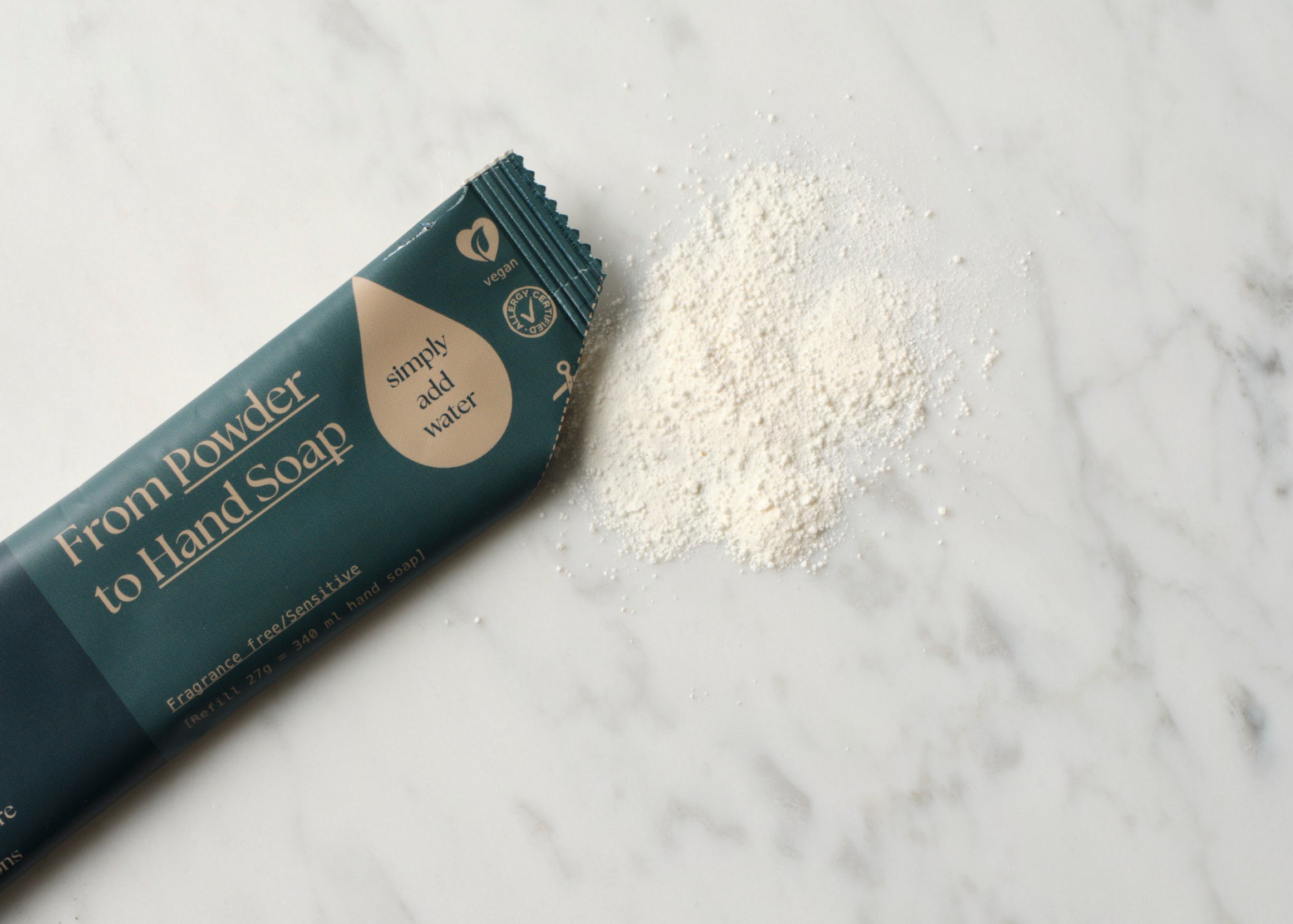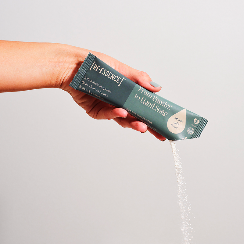 At RE·ESSENCE, our soap begins as a fine powder – a concentrate of natural ingredients that transforms into a soft, creamy soap when mixed with water.